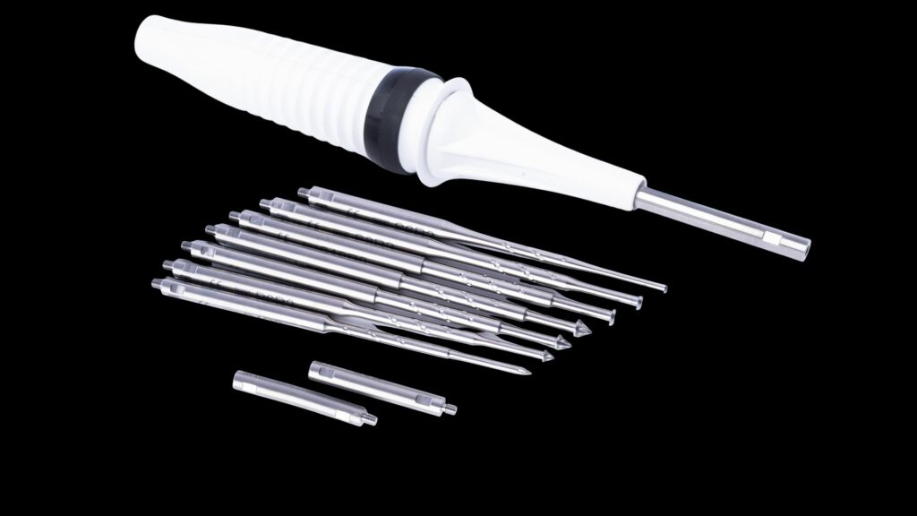 Piercers – The conical shape of the tip integrates multiple, faceted cement ports designed to work into the cement mantle. The unique 4mm piercer can be used to penetrate high-density polyethylene restrictors.