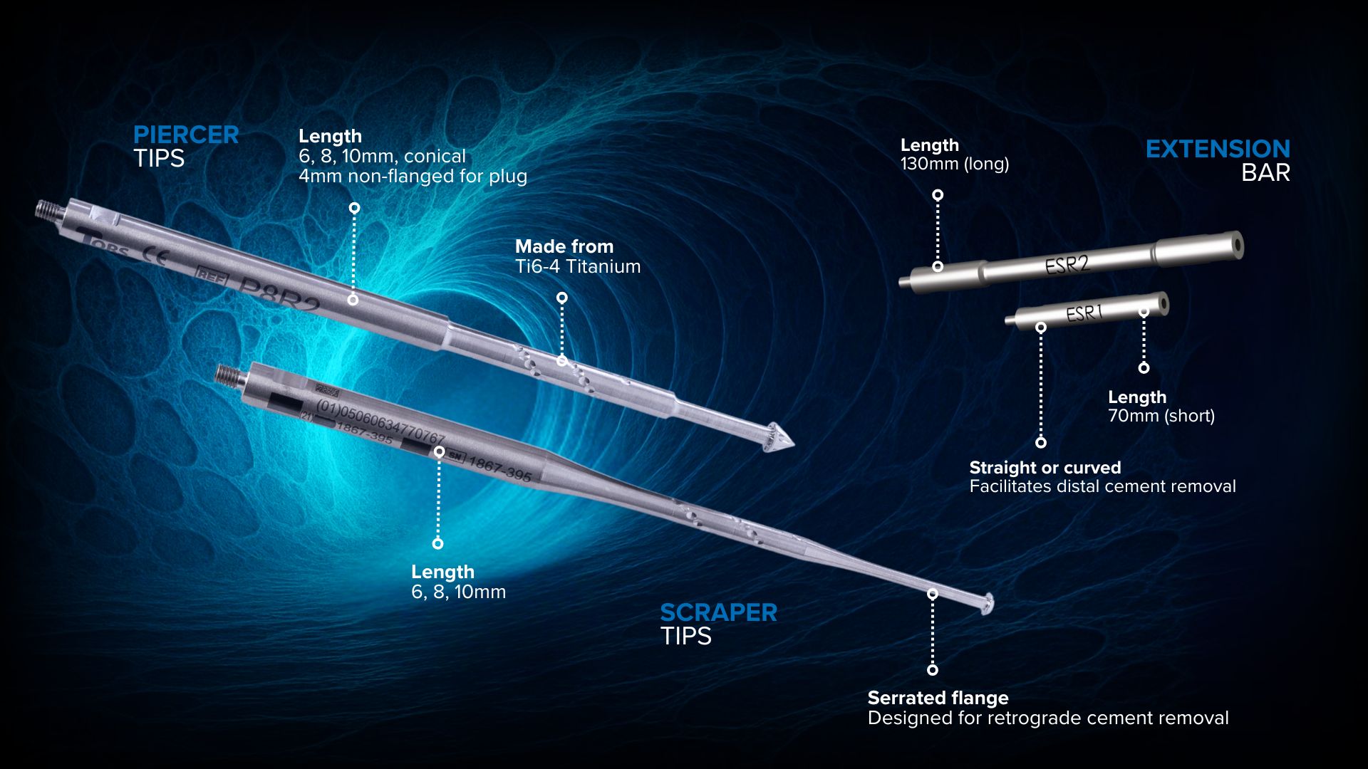 Piercers – The conical shape of the tip integrates multiple, faceted cement ports designed to work into the cement mantle. The unique 4mm piercer can be used to penetrate high-density polyethylene restrictors.